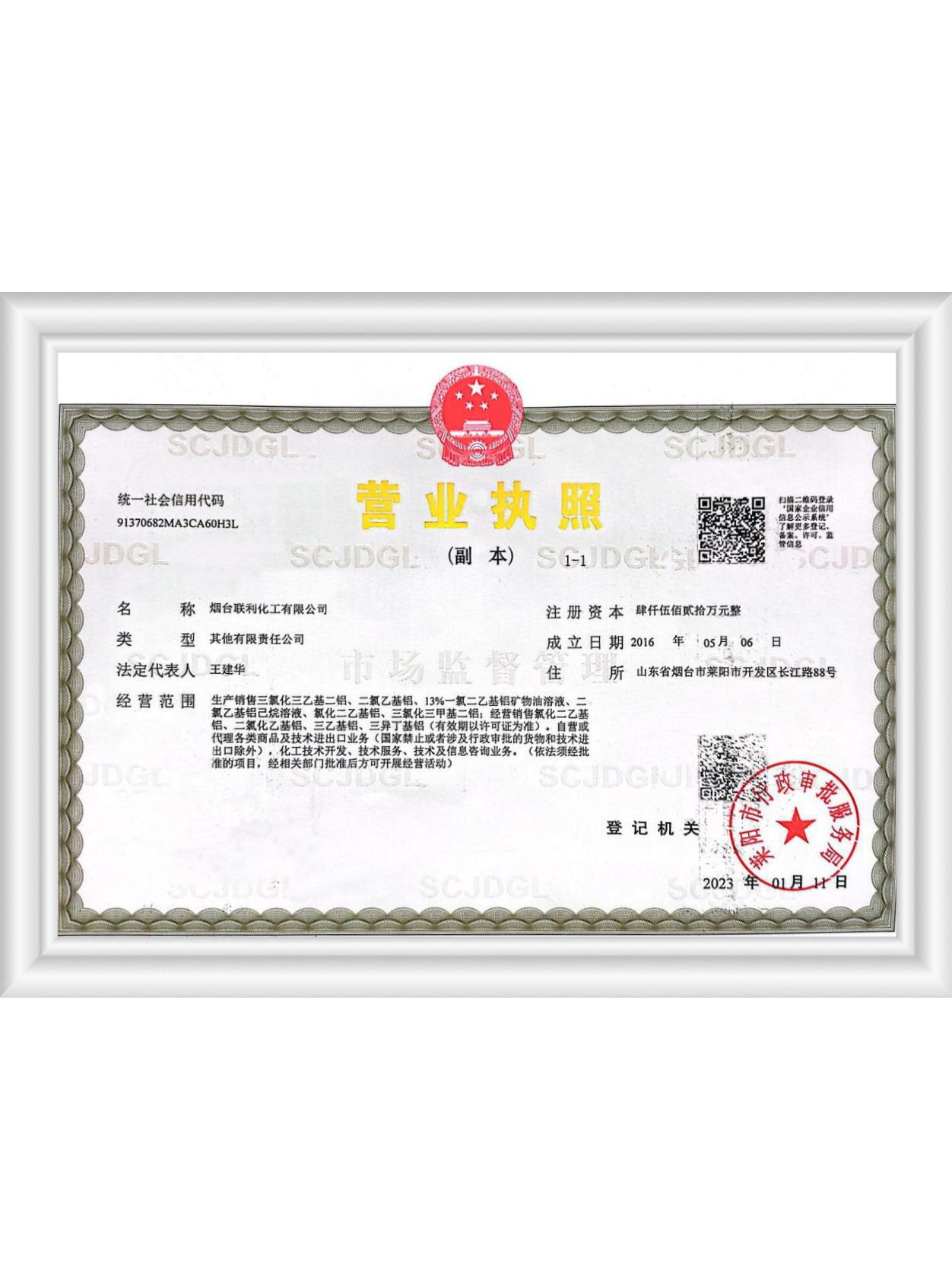 煙臺聯(lián)利化工有限公司成立于2016年5月,位于煙臺市萊陽經(jīng)濟開發(fā)區(qū)長江路88號,公司前身為1988年北京燕山石化公司技術(shù)轉(zhuǎn)讓成立的煙臺燕德化工有限公司。